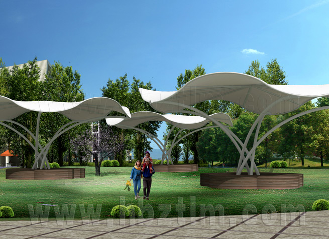 膜材采用PVDF國產或者進口建筑膜材、PTFE玻璃纖維建筑膜材、ETFE透明的永久性建筑膜材;自動放樣裁剪,高頻焊接,拉伸效果超強,曲線成型可千變萬化;膜材質保一般可達15-20年。
