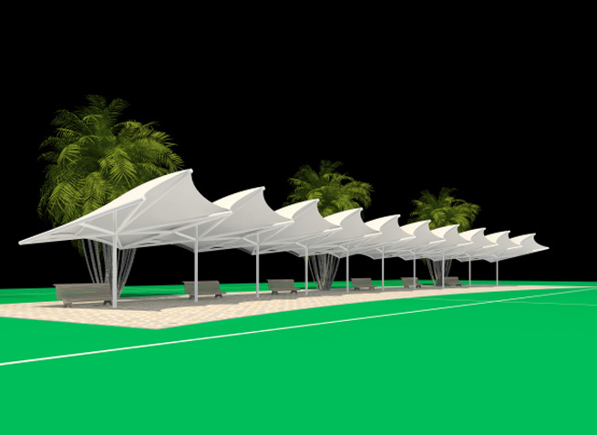 膜材采用PVDF國產(chǎn)或者進口建筑膜材、PTFE玻璃纖維建筑膜材、ETFE透明的永久性建筑膜材;自動放樣裁剪,高頻焊接,拉伸效果超強,曲線成型可千變?nèi)f化;膜材質(zhì)保一般可達15-20年。
