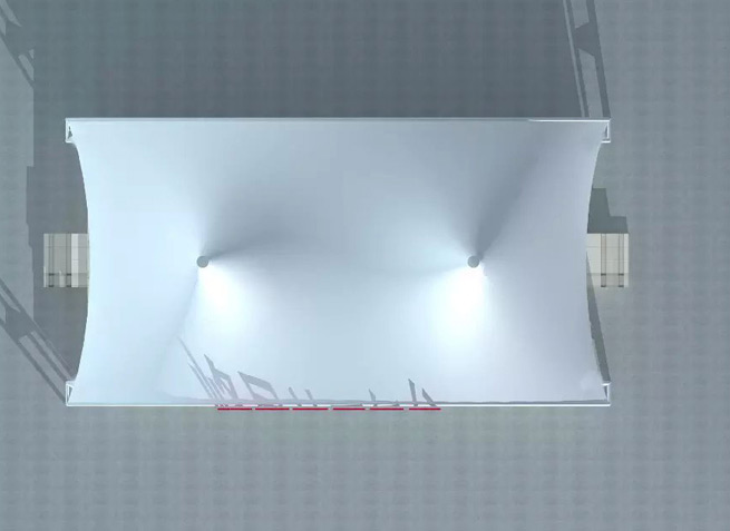 膜材采用PVDF國產(chǎn)或者進口建筑膜材、PTFE玻璃纖維建筑膜材、ETFE透明的永久性建筑膜材;自動放樣裁剪,高頻焊接,拉伸效果超強,曲線成型可千變?nèi)f化;膜材質(zhì)保一般可達(dá)15-20年。