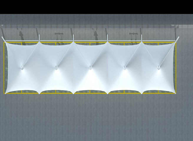 膜材采用PVDF國產或者進口建筑膜材、PTFE玻璃纖維建筑膜材、ETFE透明的永久性建筑膜材;自動放樣裁剪,高頻焊接,拉伸效果超強,曲線成型可千變萬化;膜材質保一般可達15-20年。