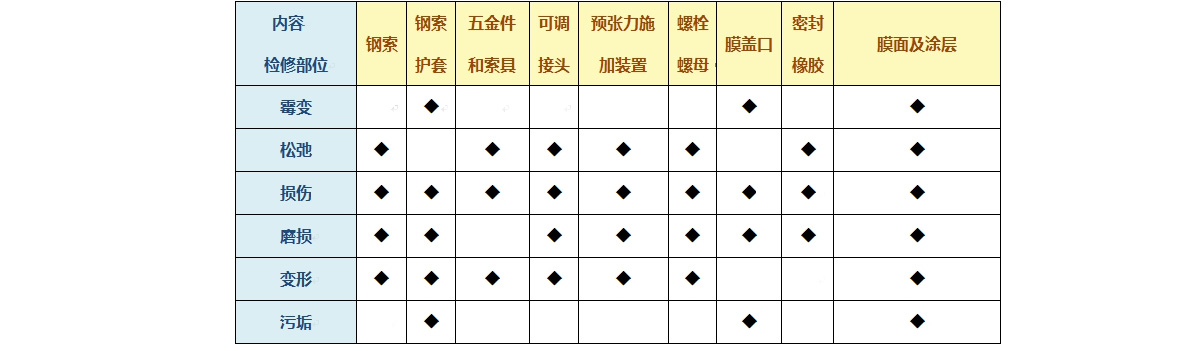 六 : 技術(shù)人員到現(xiàn)場維護或維修時應(yīng)該檢查膜結(jié)構(gòu)是否處于正常工作狀態(tài)。主要檢查項目包括:膜面有無較大變形,膜面是否因預(yù)張力損失而松弛,膜面是否局部撕裂,膜材涂層是否剝離等。