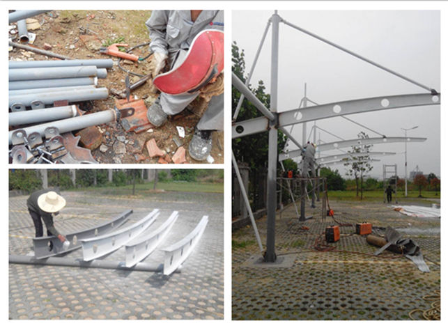 圖1 漢川吊塔式異形鋼膜結(jié)構(gòu)停車棚鋼結(jié)構(gòu)現(xiàn)場施工圖