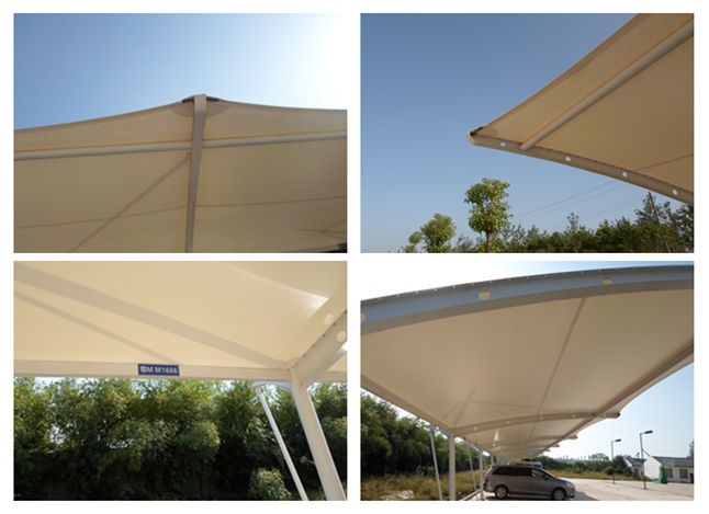 恒天嘉華吊塔式異形鋼膜結構車棚,本項目采用前軟邊后硬邊張拉形式;結構由立柱、拉桿、挑梁、橫桿構成,其挑梁和中間橫桿一般采用異形鋼挑梁形式,美觀而不積水且抗負荷能力強;膜材采用ZZF白色建筑膜材,15年質保,整體結構美觀實用,經濟牢固,臻至完美。