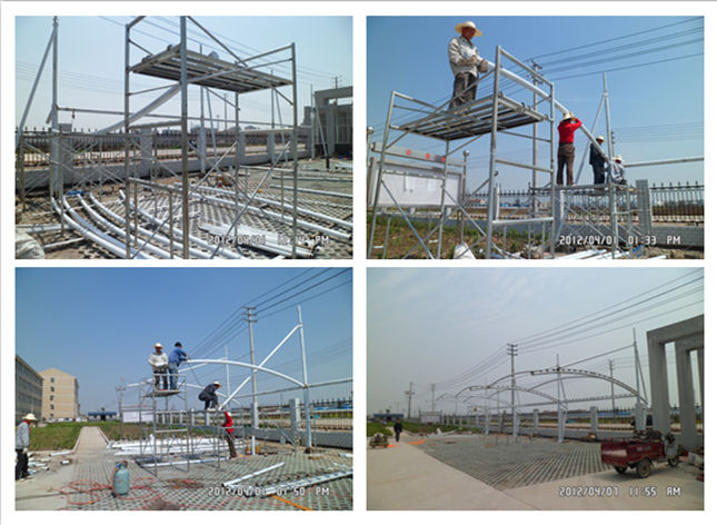 圖2 美味源公司吊塔式圓管膜結(jié)構(gòu)汽車(chē)車(chē)棚現(xiàn)場(chǎng)施工圖