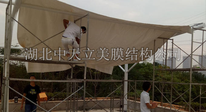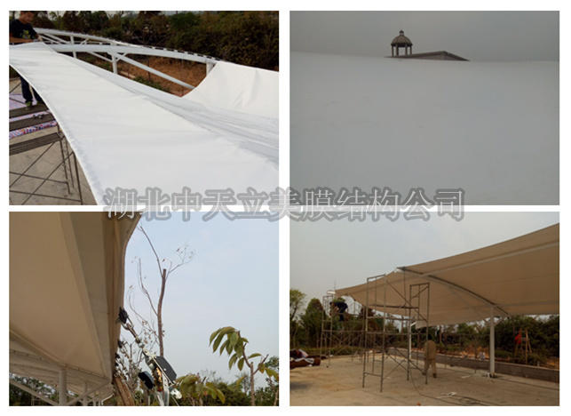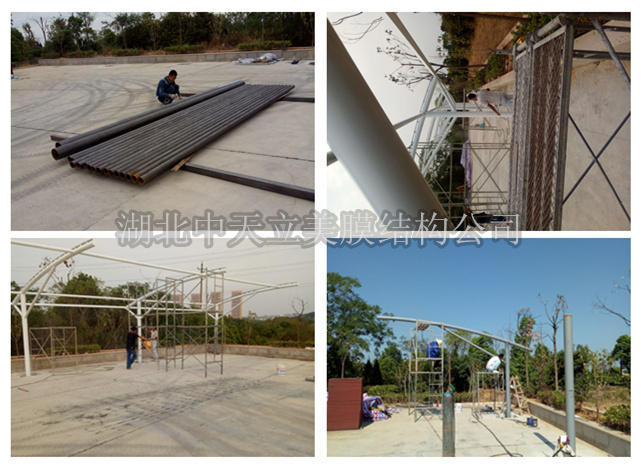 圖2 九宮山T型圓管膜結(jié)構(gòu)車棚拉膜現(xiàn)場(chǎng)施工圖