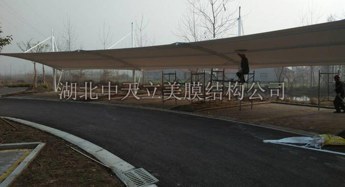 荊州江陵吊塔式圓管膜結(jié)構(gòu)車棚,本項目采用前軟邊后硬邊張拉形式,結(jié)構(gòu)由立柱、拉桿、挑梁、橫桿構(gòu)成,其挑梁和中間橫桿一般采用弧管形式,美觀而不積水且抗負荷能力強;膜材采用ZZF白色建筑膜材,15年質(zhì)保,整體結(jié)構(gòu)美觀實用,經(jīng)濟牢固,臻至完美。