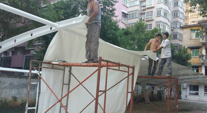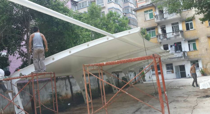 韶關氣象局L型異形鋼膜結構車棚,本項目采用前軟邊后硬邊張拉形式;結構由立柱、拉桿、挑梁、橫桿構成,其挑梁和中間橫桿一般采用異形鋼挑梁形式,美觀而不積水且抗負荷能力強;膜材采用PVDF白色車棚專用建筑膜材,15年質保,整體結構美觀實用,經濟牢固,臻至完美。