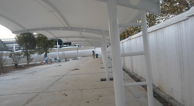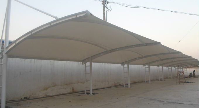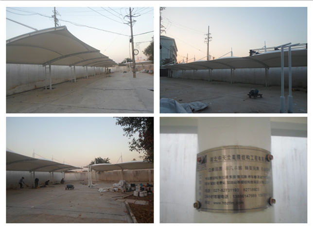 新溝街道辦事處吊塔式異形鋼膜結構停車棚,本項目采用前軟邊后硬邊張拉形式;結構由立柱、拉桿、挑梁、橫桿構成,其挑梁和中間橫桿一般采用異形鋼挑梁形式,美觀而不積水且抗負荷能力強;膜材采用PVDF白色車棚專用建筑膜材,15年質保,整體結構美觀實用,經(jīng)濟牢固,臻至完美。
