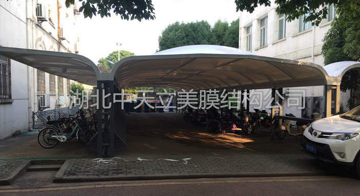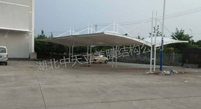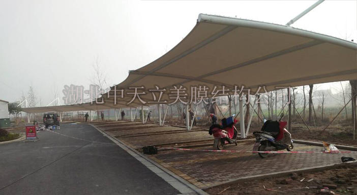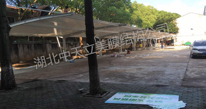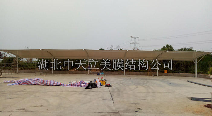 湖北泰盟電氣公司與中天立美膜結(jié)構(gòu)公司簽訂膜結(jié)構(gòu)車棚及膜結(jié)構(gòu)自行車棚項(xiàng)目,這次膜結(jié)構(gòu)車棚?客戶選用雙挑異型鋼吊塔式膜結(jié)構(gòu)車棚樣式,整體造型美觀,大方,實(shí)用,是很多客戶首選車棚樣式之一。