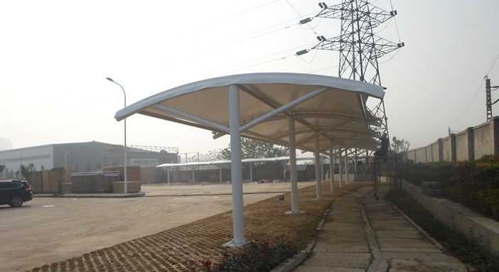 五子溝武漢機(jī)床廠T型圓管膜結(jié)構(gòu)車棚,本項(xiàng)目采用前軟邊后硬邊張拉形式,結(jié)構(gòu)由立柱、拉桿、挑梁、橫桿構(gòu)成,其挑梁和中間橫桿一般采用弧型圓管挑梁形式,美觀而不積水且抗負(fù)荷能力強(qiáng);膜材采用PVDF白色車棚專用建筑膜材,15年質(zhì)保,整體結(jié)構(gòu)美觀實(shí)用,經(jīng)濟(jì)牢固,臻至完美。