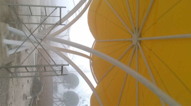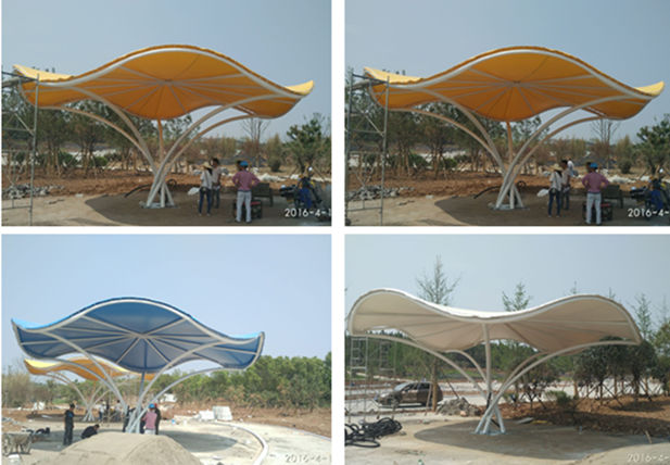 荊門市千佛洞植物園一期二標(biāo)園林景觀膜結(jié)構(gòu)工程,該項目結(jié)構(gòu)以荷葉的外形為基本參照設(shè)計,全弧管結(jié)構(gòu)拼裝,做工精細,整體流線型的外形和建筑膜材全硬邊式張拉給人以剛?cè)嶂?,為了豐富其視角效果,我們采用了彩色建筑膜以示渲染,作為公園的休閑景觀,既給人以納涼之處,又給整體環(huán)境以時尚現(xiàn)代之美。此類結(jié)構(gòu)被廣泛應(yīng)用于公園、江河湖畔、廣場、景區(qū)等。