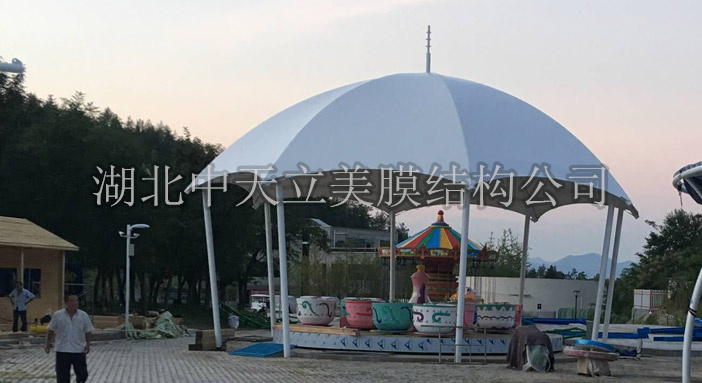 十堰市櫻桃小鎮(zhèn)親子樂園轉(zhuǎn)轉(zhuǎn)杯頂棚膜結構現(xiàn)場鋼結構 膜結構完工