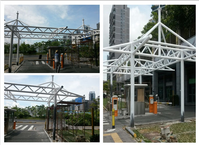 圖1 深圳羅湖小區(qū)大門門頭膜結(jié)構(gòu)鋼結(jié)構(gòu)現(xiàn)場施工圖