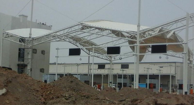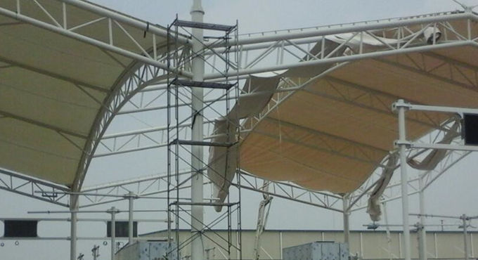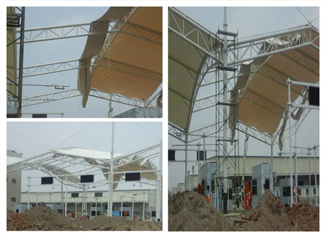 圖1 湖南衡陽工業(yè)園大門門頭膜結(jié)構(gòu)鋼結(jié)構(gòu)現(xiàn)場(chǎng)施工圖